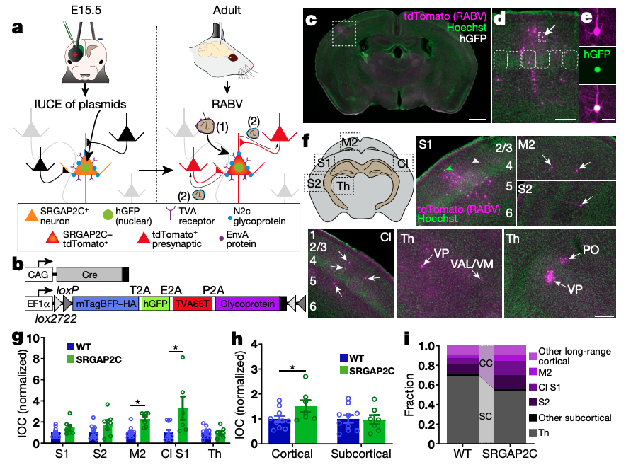The cognitive abilities that characterize humans are thought to emerge from unique features of the cortical circuit architecture of the human brain, which include increased cortico-cortical connectivity. However, the evolutionary origin of these changes in connectivity and how they affected cortical circuit function and behaviour are currently unknown. The human-specific gene duplication SRGAP2C emerged in the ancestral genome of the Homo lineage before the major phase of increase in brain size1,2. SRGAP2C expression in mice increases the density of excitatory and inhibitory synapses received by layer 2/3 pyramidal neurons (PNs)3-5. Here we show that the increased number of excitatory synapses received by layer 2/3 PNs induced by SRGAP2C expression originates from a specific increase in local and long-range cortico-cortical connections. Mice humanized for SRGAP2C expression in all cortical PNs displayed a shift in the fraction of layer 2/3 PNs activated by sensory stimulation and an enhanced ability to learn a cortex-dependent sensory-discrimination task. Computational modelling revealed that the increased layer 4 to layer 2/3 connectivity induced by SRGAP2C expression explains some of the key changes in sensory coding properties. These results suggest that the emergence of SRGAP2C at the birth of the Homo lineage contributed to the evolution of specific structural and functional features of cortical circuits in the human cortex.