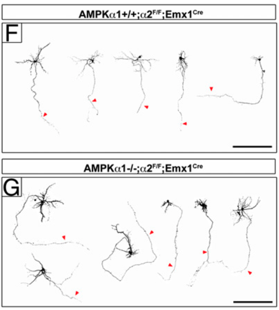 Mammalian brain connectivity requires the coordinated production and migration of billions of neurons and the formation of axons and dendrites. The LKB1/Par4 kinase is required for axon formation during cortical development in vivo partially through its ability to activate SAD-A/B kinases. LKB1 is a master kinase phosphorylating and activating at least 11 other serine/threonine kinases including the metabolic sensor AMP-activated protein kinase (AMPK), which defines this branch of the kinome. A recent study using a gene-trap allele of the β1 regulatory subunit of AMPK suggested that AMPK catalytic activity is required for proper brain development includ- ing neurogenesis and neuronal survival. We used a genetic loss- of-function approach producing AMPKα1/α2-null cortical neurons to demonstrate that AMPK catalytic activity is not required for cortical neurogenesis, neuronal migration, polarization, or survival. However, we found that application of metformin or AICAR, potent AMPK acti- vators, inhibit axogenesis and axon growth in an AMPK-dependent manner. We show that inhibition of axon growth mediated by AMPK overactivation requires TSC1/2-mediated inhibition of the mamma- lian target of rapamycin (mTOR) signaling pathway. Our results dem- onstrate that AMPK catalytic activity is not required for early neural development in vivo but its overactivation during metabolic stress impairs neuronal polarization in a mTOR-dependent manner.