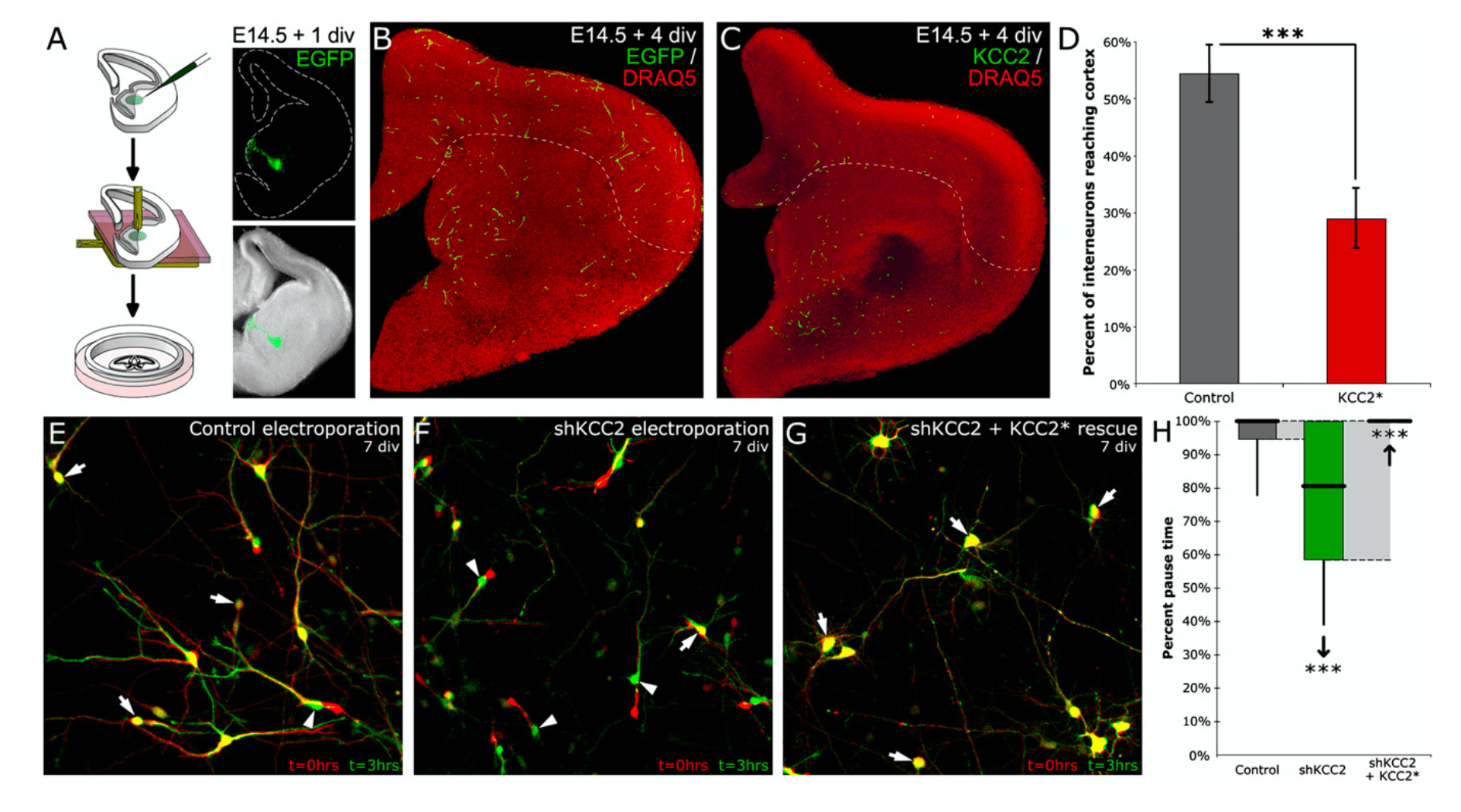 The molecular mechanisms controlling the termina- tion of cortical interneuron migration are unknown. Here, we demonstrate that, prior to synaptogenesis, migrating interneurons change their responsiveness to ambient GABA from a motogenic to a stop signal. We found that, during migration into the cortex, ambient GABA and glutamate initially stimulate the motility of interneurons through both GABAA and AMPA/NMDA receptor activation. Once in the cortex, upregulation of the potassium-chloride cotransporter KCC2 is both necessary and sufficient to reduce inter- neuron motility through its ability to reduce membrane potential upon GABAA receptor activation, which decreases the frequency of spontaneous intracellular calcium transients initiated by L-type voltage-sensi- tive calcium channel (VSCC) activation. Our results suggest a mechanism whereby migrating interneu- rons determine the relative density of surrounding interneurons and principal cells through their ability to sense the combined extracellular levels of ambient glutamate and GABA once GABAA receptor activation becomes hyperpolarizing.