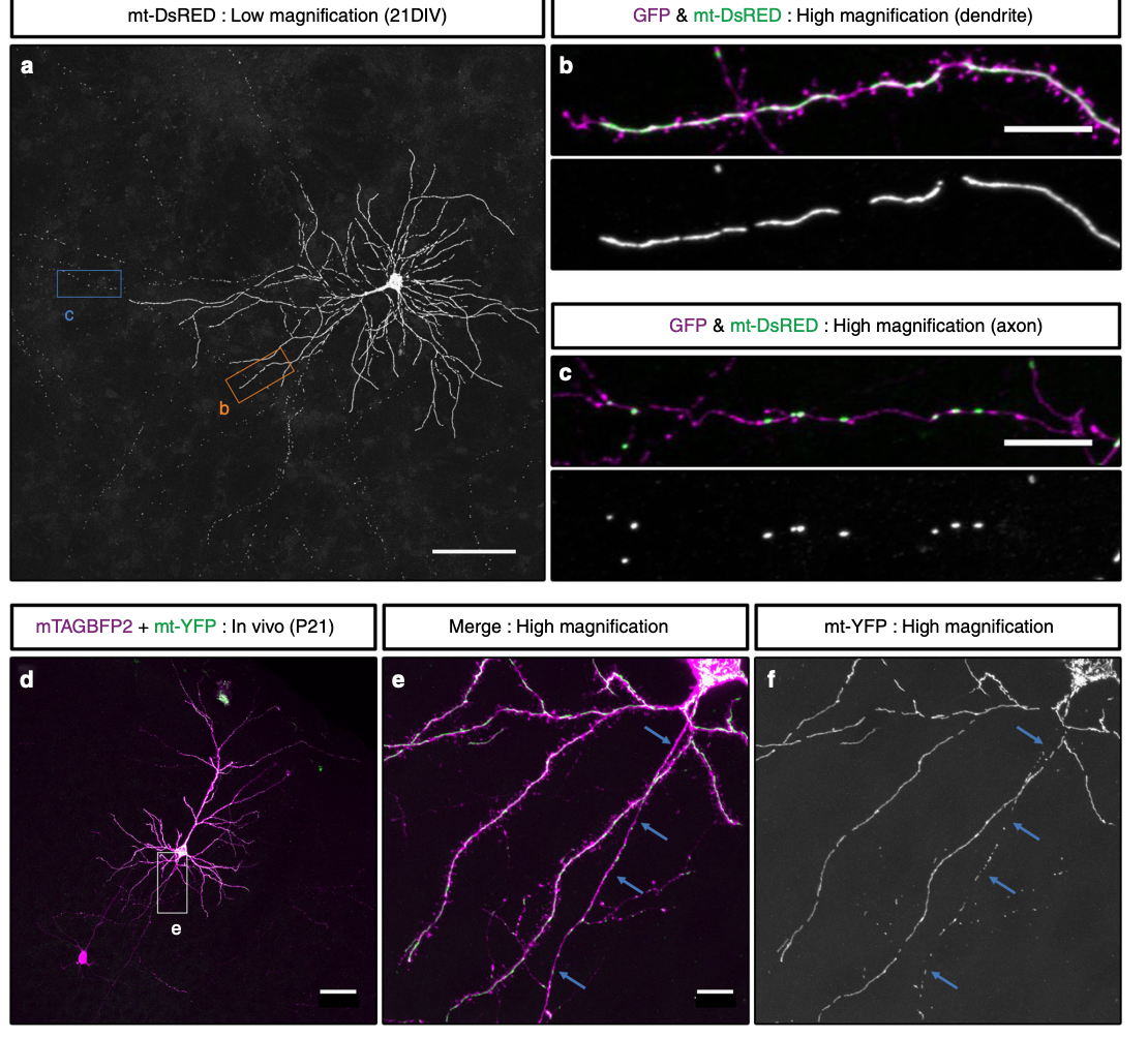 Neurons display extreme degrees of polarization, including compartment-specific organelle morphology. In cortical, long-range projecting, pyramidal neurons (PNs), dendritic mitochondria are long and tubular whereas axonal mitochondria display uniformly short length. Here we explored the functional significance of maintaining small mitochondria for axonal development in vitro and in vivo. We report that the Drp1 'receptor' Mitochondrial fission factor (MFF) is required for determining the size of mitochondria entering the axon and then for maintenance of their size along the distal portions of the axon without affecting their trafficking properties, presynaptic capture, membrane potential or ability to generate ATP. Strikingly, this increase in presynaptic mitochondrial size upon MFF downregulation augments their capacity for Ca2+ ([Ca2+]m) uptake during neurotransmission, leading to reduced presynaptic [Ca2+]c accumulation, decreased presynaptic release and terminal axon branching. Our results uncover a novel mechanism controlling neurotransmitter release and axon branching through fission-dependent regulation of presynaptic mitochondrial size.