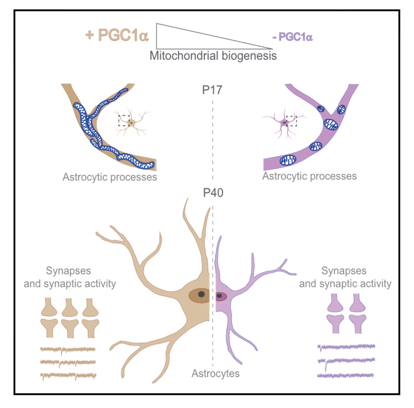 The mechanisms controlling the post-natal maturation of astrocytes play a crucial role in ensuring correct synaptogenesis. We show that mitochondrial biogenesis in developing astrocytes is necessary for coordinating post-natal astrocyte maturation and synaptogenesis. The astrocytic mitochondrial biogenesis depends on the transient upregulation of metabolic regulator peroxisome proliferator-activated receptor gamma (PPARγ) co-activator 1α (PGC-1α), which is controlled by metabotropic glutamate receptor 5 (mGluR5). At tissue level, the loss or downregulation of astrocytic PGC-1α sustains astrocyte proliferation, dampens astrocyte morphogenesis, and impairs the formation and function of neighboring synapses, whereas its genetic re-expression is sufficient to restore the mitochondria compartment and correct astroglial and synaptic defects. Our findings show that the developmental enhancement of mitochondrial biogenesis in astrocytes is a critical mechanism controlling astrocyte maturation and supporting synaptogenesis, thus suggesting that astrocytic mitochondria may be a therapeutic target in the case of neurodevelopmental and psychiatric disorders characterized by impaired synaptogenesis.