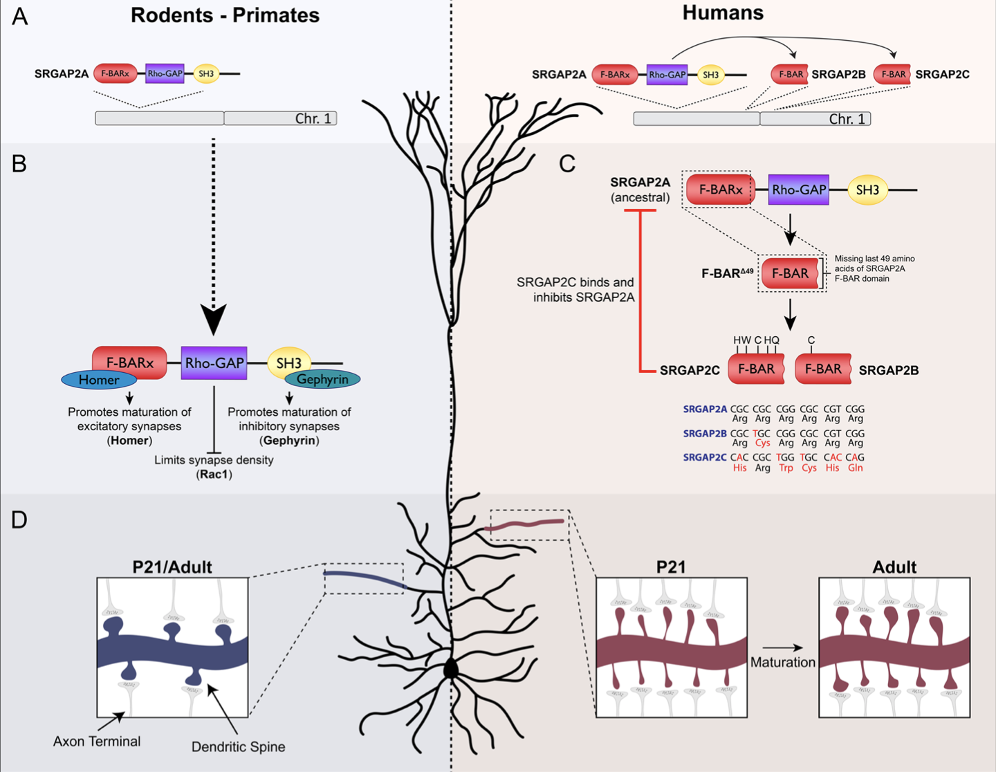 Human-specific gene duplications (HSGDs) have recently emerged as key modifiers of brain development and evolution. However, the molecular mechanisms underlying the function of HSGDs remain often poorly understood. In humans, a truncated duplication of SRGAP2A led to the emergence of two human-specific paralogs: SRGAP2B and SRGAP2C. The ancestral copy SRGAP2A limits synaptic density and promotes maturation of both excitatory (E) and inhibitory (I) synapses received by cortical pyramidal neurons (PNs). SRGAP2C binds to and inhibits all known functions of SRGAP2A leading to an increase in E and I synapse density and protracted synapse maturation, traits characterizing human cortical neurons. Here, we demonstrate how the evolutionary changes that led to the emergence of SRGAP2 HSGDs generated proteins that, in neurons, are intrinsically unstable and, upon hetero- dimerization with SRGAP2A, reduce SRGAP2A levels in a proteasome-dependent manner. Moreover, we show that, despite only a few non-synonymous mutations specifically targeting arginine residues, SRGAP2C is unique compared to SRGAP2B in its ability to induce long-lasting changes in synaptic density throughout adulthood. These mutations led to the ability of SRGAP2C to inhibit SRGAP2A function and thereby contribute to the emergence of human-specific features of synaptic development during evolution.